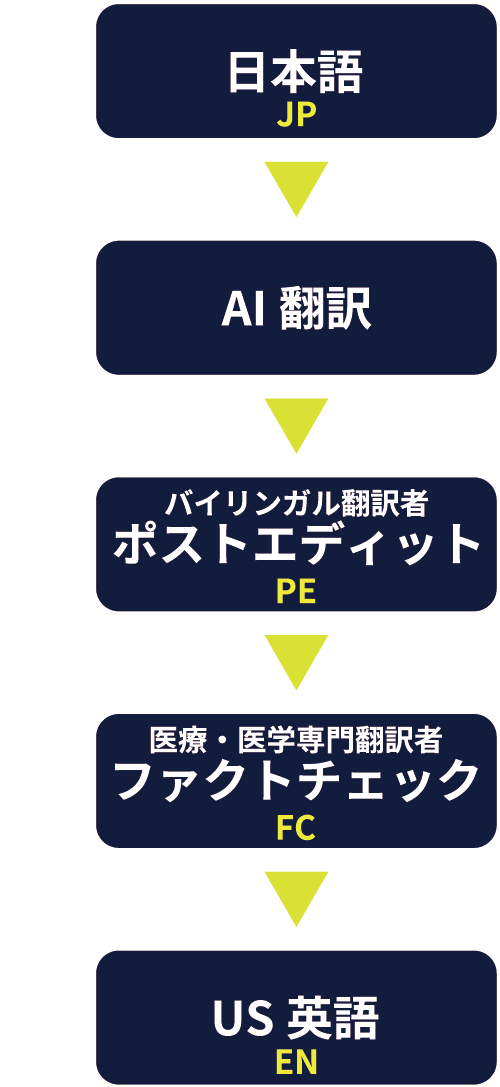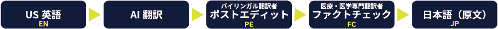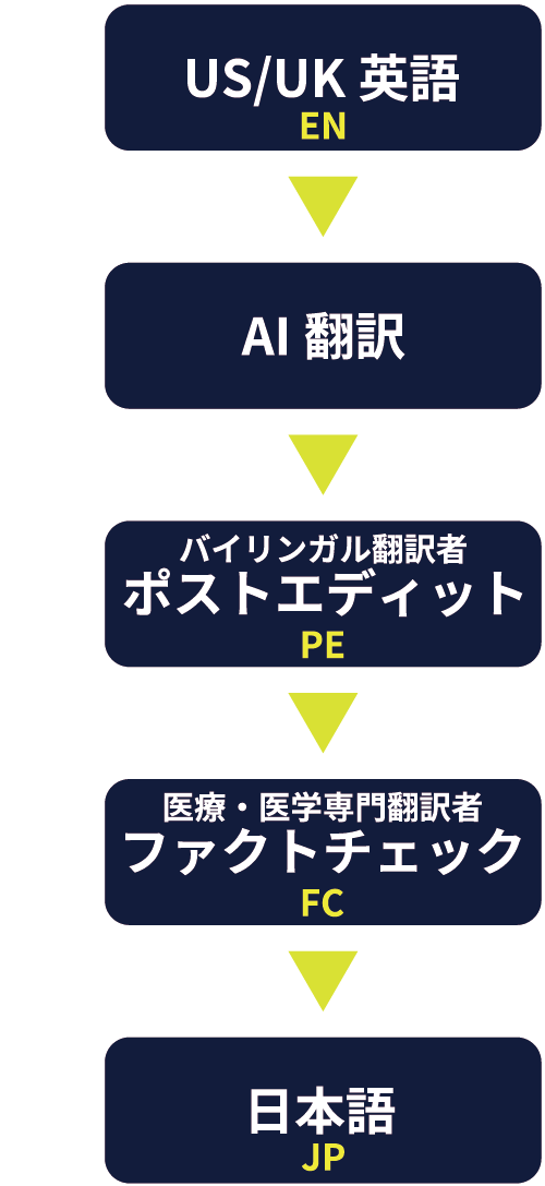 機械翻訳やAI翻訳等で、お客様が翻訳されたデータをお送りいただき、NAIwayが、バイリンガルによるポストエディットと医療専門翻訳者によるファクトチェックを実施します。